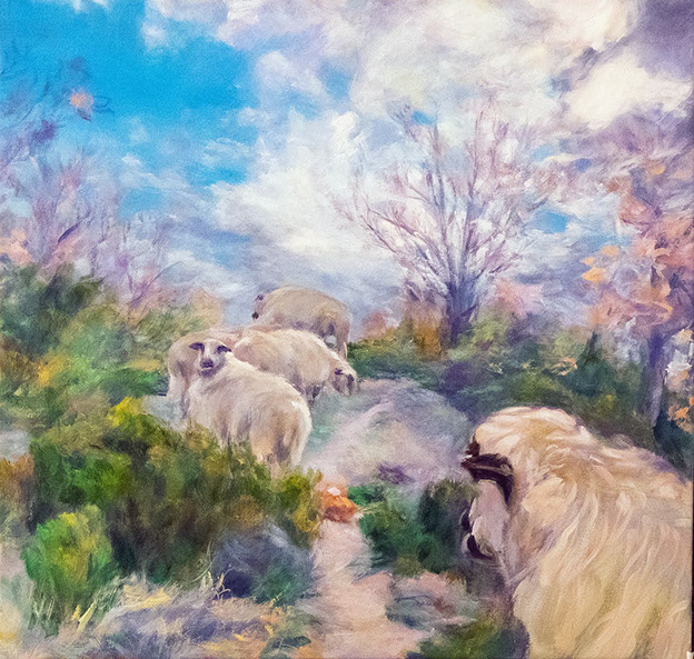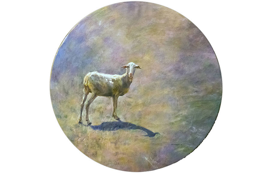 Pilar, de pronto, en su dinámica vital, centra su mirada en un paisaje carnal y abre el espejo donde reconocernos en el destello de inteligencia de unos ojos bovinos. Sus ovejas, actores indiscutibles del paisaje, nos miran desde la tela con ironía y parecen decirnos que no somos tan diferentes, animales al fin. Las retrata con un lenguaje cargado de simbolismo en el que ser no necesita de apariencias. La pintora introduce un fuerte sentimiento vitalista en la construcción de un universo que define al Ser con ser, libre de denominaciones, habitantes todos de un mismo planeta, códigos binarios de la evolución.